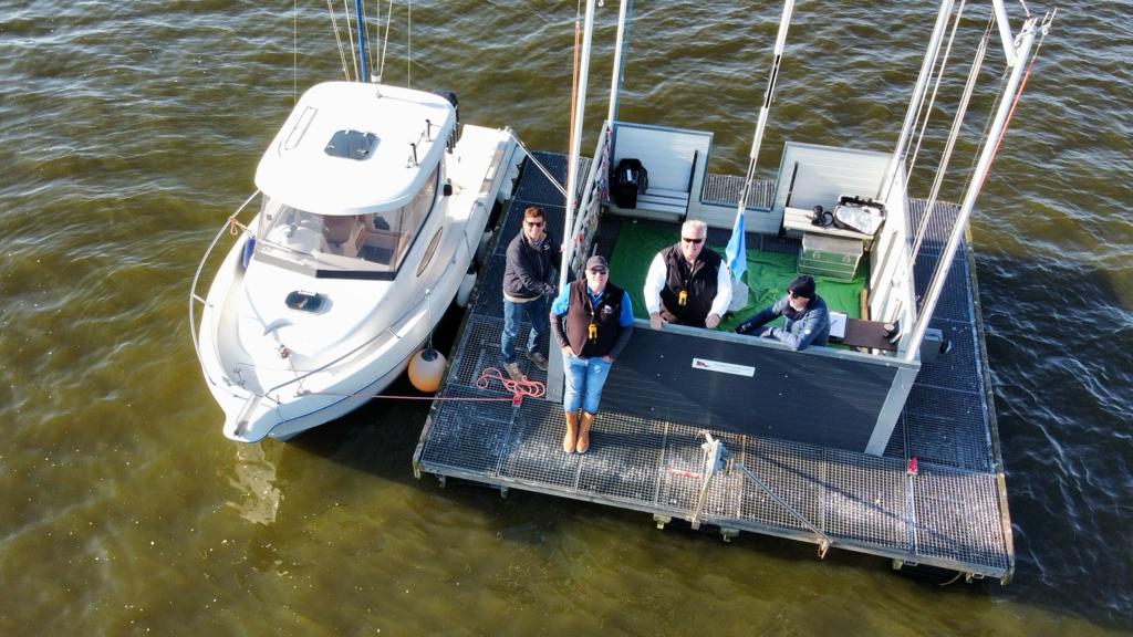 sind Mitglieder mit einem Gast auf dem Weg zu und von ihrem Boot oder im Rahmen